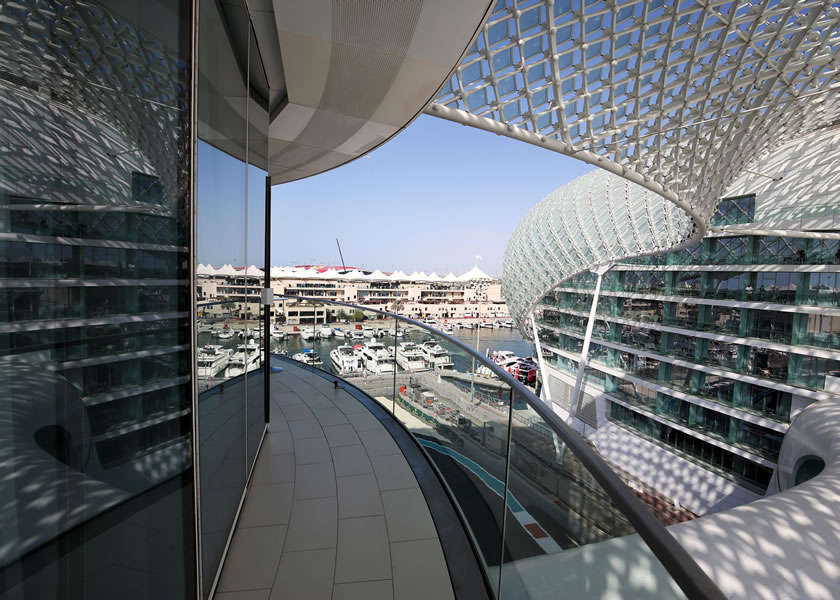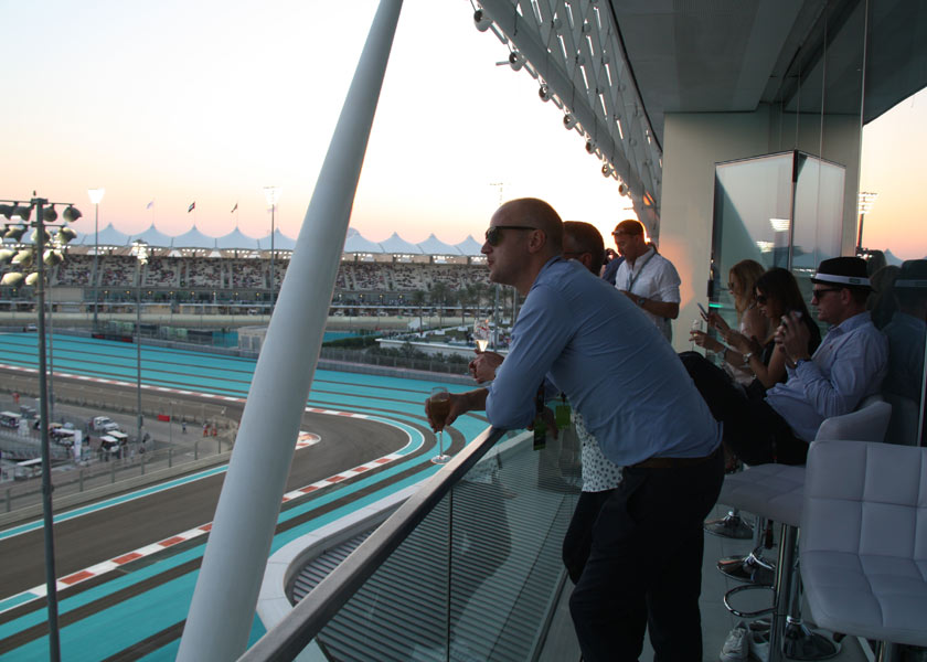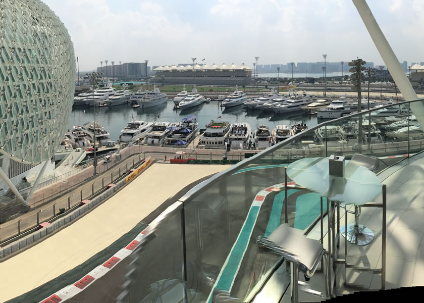 This is the ultimate race viewing suite at W Hotel. Situated on the 5th floor, it offers prime views of cars navigating 90◦ corners 17 & 18, racing around yachts in the harbour, and speeding towards the start/finish line. The spacious balcony provides panoramic views of both sides of Yas Marina Circuit. The iconic Yas Hotel serves as a stunning backdrop for F1® action. Guests enjoy a hot buffet luncheon, evening snacks, and an open bar with premium drinks.